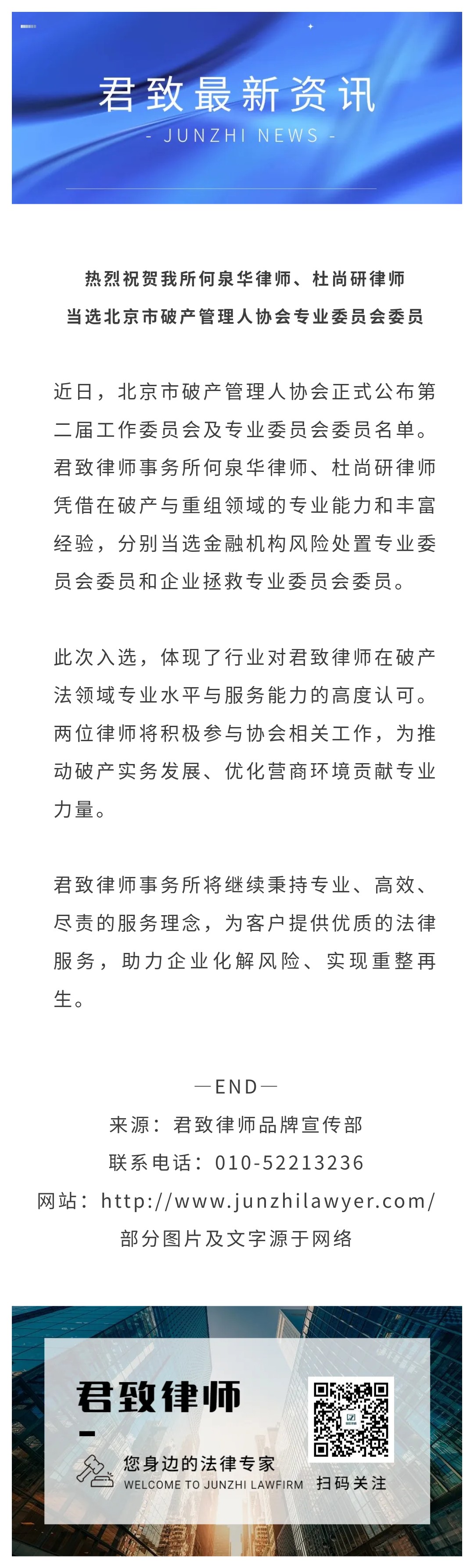 君致资讯|热烈祝贺我所何泉华律师、杜尚研律师当选北京市破产管理人协会专业委员会委员