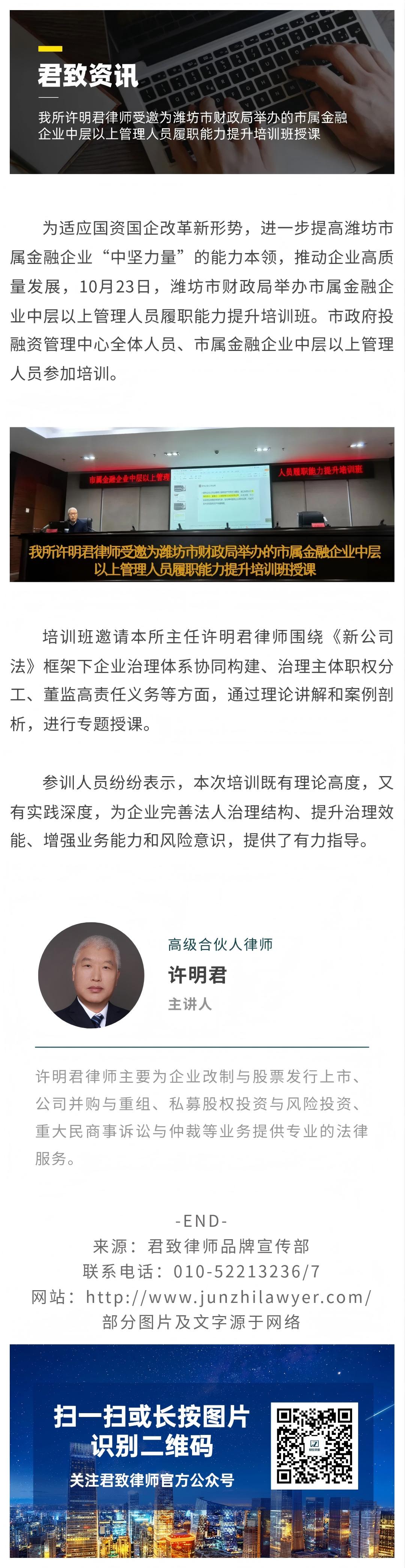 君致资讯|我所许明君律师受邀为潍坊市财政局举办的市属金融企业中层以上管理人员履职能力提升培训班授课