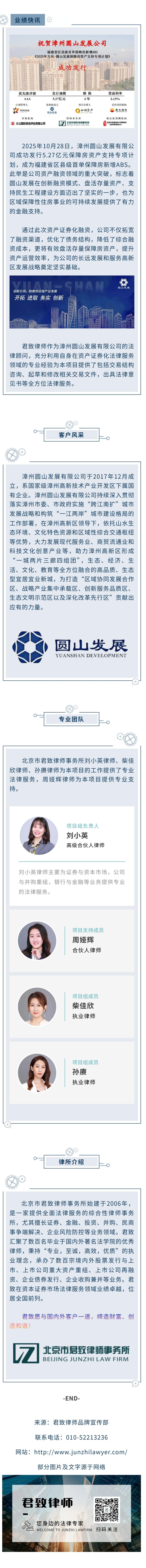 君致业绩|君致助力漳州圆山发展有限公司成功发行福建省区县级首单保障房新增ABS—2025年天风-圆山发展保障房资产支持专项计划