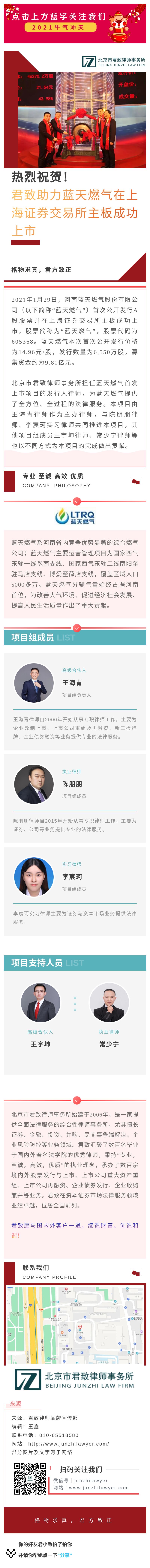 君致业绩|君致助力蓝天燃气在上海证券交易所主板成功上市