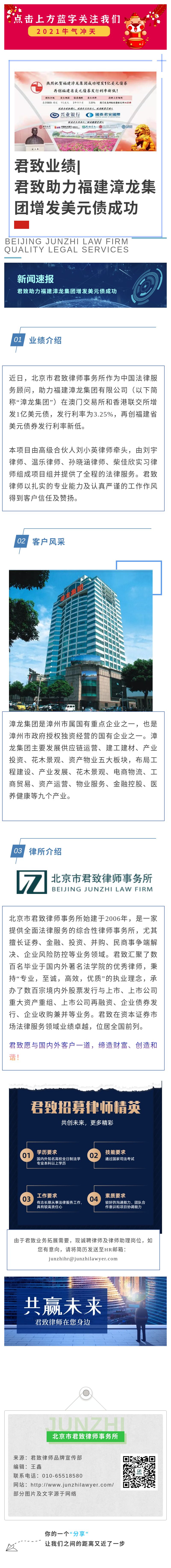 君致业绩|君致助力福建漳龙集团增发美元债成功